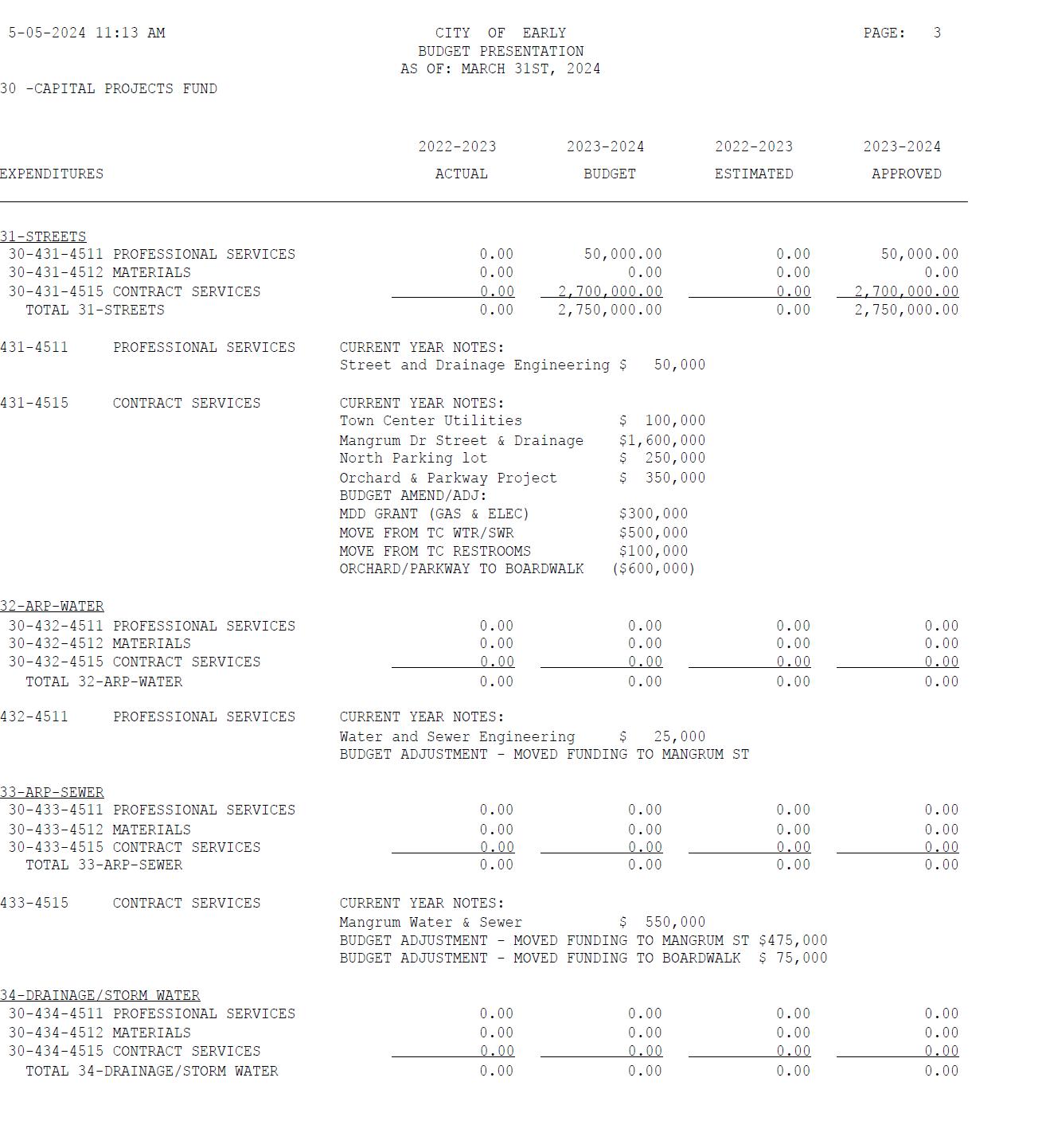 2023-2024 ADOPTED BUDGET City of Early, TX | FY2023-2024 Adopted Budget 62 Town Kelcy Way Street, drainage, streetscaping & lighting Capital Improvement Special Project Funding (Sales Tax) $1M $0 Town Town Center Mangrum Capital Improvement MDD/Gen Funds EDA Grant $75K $1.5M $1.575M Town Town Center Mangrum (Water & Sewer) Capital Improvement EDA/General $65K $473K $538K Town Town Center Mangrum (Gas, Electric, and Fiber) Capital Improvement MDD/Gen Funds 400K $400K Town Town Center Boardwalk Capital Improvement MDD/ Gen Funds $65K $1.8M $1.865M Town Town Center Park Restroom Capital Improvement ARPA $5K $200K $205K Town Town Center Park Improvements Capital Improvement HAAP Grant/Gen Funds $340K $340K Town Kelcy Way utility access (water & sewer) Capital Improvement Water/Sewer $30K $0 Water Water Meter Replacement Program Capital Improvement ARPA ($100,000) Water $40K $160K $80K $40K $40K $40K $360K Water Elevated Tower Water Mixer Capital Improvement ARPA $27K $27K Water Automatic Electrical Transfer Switch at the Pumpstation Capital Improvement Water $20K $20K Water / Sewer Mitsy Ln Water/Sewer Project Capital Improvement Water/Sewer $100K $100K Residential Development Wester Trail Subdivision Capital Improvement PPP $50K $75K $125K Residential Development Longhorn Subdivision Phase 1 Water, Sewer, Street construction Capital Improvement PPP $100K $500K $600K Residential Development Early Estate (Salt Creek) Street Construction Capital Improvement PPP $700K $700K Sewer Crescent Neighborhood Sewer Project Capital Improvement ARPA ($100,000) TWDB funds $800K $800K Sewer Replace Sewer line at Early Blvd at Pecan Bayou Capital Improvement Sewer $100K $100K Sewer Barn/Shed WWTP Capital Improvement Sewer $30K $30K Parks McDonald Park Pavilion Capital Improvement PPP $65K $0 Parks Early Ballpark Improvements Capital Improvement General Funds $59K $20K $50K $300K $50K $420K Administration Backup Generation Equipment FEMA Grant Funded $231,165 $231,165