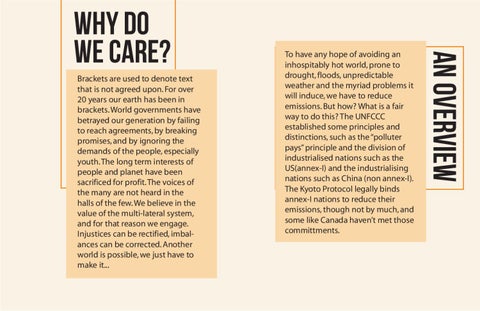 Brackets are used to denote text that is not agreed upon. For over 20 years our earth has been in brackets. World governments have betrayed our generation by failing to reach agreements, by breaking promises, and by ignoring the demands of the people, especially youth. The long term interests of people and planet have been sacrificed for profit. The voices of the many are not heard in the halls of the few. We believe in the value of the multi-lateral system, and for that reason we engage. Injustices can be rectified, imbalances can be corrected. Another world is possible, we just have to make it...