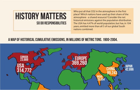 Who put all that CO2 in the atmosphere in the first place? Which nations have used up their share of the atmosphere - a shared resource? Consider the net historical emissions against the population distribution. The USA has 4.47% of world population, but has, in 104 years, emitted more than all 5 of our global South nations combined.