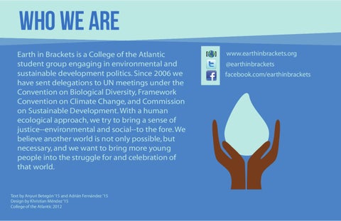 who we are Earth in Brackets is a College of the Atlantic student group engaging in environmental and sustainable development politics. Since 2006 we have sent delegations to UN meetings under the Convention on Biological Diversity, Framework Convention on Climate Change, and Commission on Sustainable Development. With a human ecological approach, we try to bring a sense of justice--environmental and social--to the fore. We believe another world is not only possible, but necessary, and we want to bring more young people into the struggle for and celebration of that world.