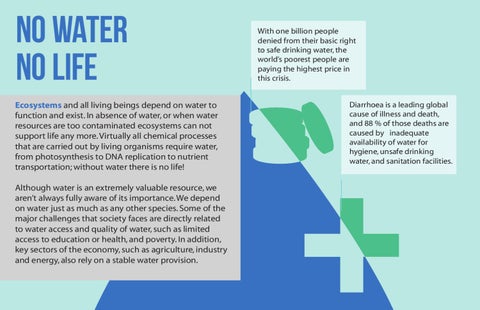 No Water No Life Ecosystems and all living beings depend on water to function and exist. In absence of water, or when water resources are too contaminated ecosystems can not support life any more. Virtually all chemical processes that are carried out by living organisms require water, from photosynthesis to DNA replication to nutrient transportation; without water there is no life! Although water is an extremely valuable resource, we aren’t always fully aware of its importance. We depend on water just as much as any other species. Some of the major challenges that society faces are directly related to water access and quality of water, such as limited access to education or health, and poverty. In addition, key sectors of the economy, such as agriculture, industry and energy, also rely on a stable water provision.
