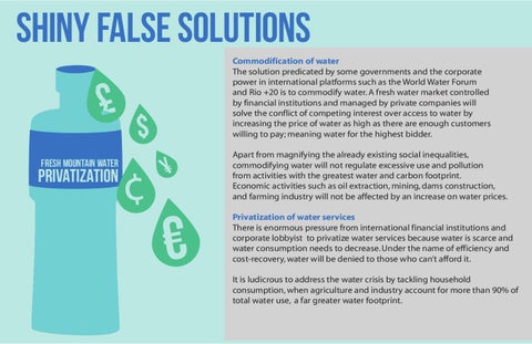 Shiny false solutions Commodification of water The solution predicated by some governments and the corporate power in international platforms such as the World Water Forum and Rio +20 is to commodify water. A fresh water market controlled by financial institutions and managed by private companies will solve the conflict of competing interest over access to water by increasing the price of water as high as there are enough customers willing to pay; meaning water for the highest bidder.