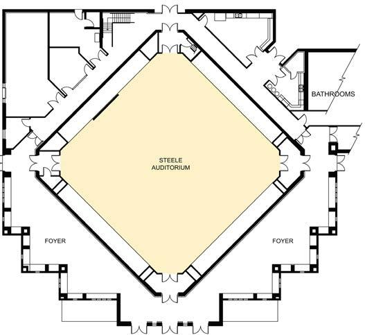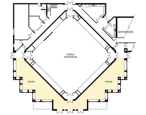 Majestic ceiling-high windows are a central feature of this space filled end to end with window seats, creating an intimate gathering place. Wonderful for a cocktail hour preceding a dinner event in Steele Auditorium, or for use as a registration/exhibit area for corporate events.