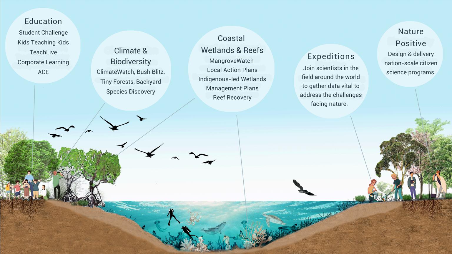 Our work champions impactful research, on-ground action, and education across key environmental areas, including Education, Climate & Biodiversity, Coastal Wetlands & Reefs, Scientific Expeditions, and nation-scale Citizen Science programming