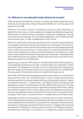 1.6. Millised on tarneklauslite kõige tähtsamad nõuded? Kõige tähtsamad tarneklauslite nõuded on esitatud iga üksiku tarneklausli puhul esimeses kuues alapunktis. Müüja kohustused artiklites A1 kuni A6, ostja omad vastavalt B1 kuni B6. Artiklite A1 ja B1 tekst on kõigi 11 tarneklausli puhul üks ja sama. Sätestatud on kõige tähtsam kohustus, mis kummalgi poolel müügilepingu allakirjutamisega tekib. Müüja peab (A1) tarnima kauba ja kaubaarve vastavuses müügilepingu ning iga teise vastavuse tunnistusega, mis võib olla lepingujärgselt nõutud. Ostja peab (B1) tasuma kauba hinna, nii nagu müügilepingus on ette nähtud. Artiklid A2 ja B2 fikseerivad poolte kohustused tolli- ja turvaformaalsuste täitmise ning sellega kaasnevate kulude ja riski kandmise osas. Normaalse kohustuste jaotuse korral täidab kumbki pool kõik tolliformaalsused ja kannab sellega kaasnevad kulud ja riskid oma asukohamaal, s.o müüja ekspordi- ja ostja impordi-tolliformaalsused. Selline tollikohustuste jaotus on 9 tarneklausli puhul. 2 tarneklauslil on kogu tolliformaalsuste täitmine pandud ühe lepingupoole kohustuseks. Ostja peab täitma kõik tolliformaalsused ning kandma sellega kaasnevad kulud ja riski EXW puhul. Müüja kohustuseks on see DDP puhul. Igal pool kogu Incoterms® 2010 ulatuses, kus käsitletakse tolliformaalsuste täitmist ning sellega kaasnevaid kulutusi ja riske, on lisatud sõnad “kus asjakohane” (where applicable). See tähendab, et juhtudel, kui tolli ja tollinõudeid pole, langevad ära ka poolte vastavad kohustused. See formuleering lubab Incoterms’i tarneklausleid ilma igasuguste mööndusteta kasutada ka siseriiklike tehingute puhul. Artiklid A3 ja B3 fikseerivad müügilepingu poolte kohustused veo- ja kindlustuslepingu sõlmimise osas. Kui ühel lepingupoolel, nt ostjal, puudub otsene kohustus teise lepingupoole ees vastavat lepingut sõlmida, siis kasutatakse väljendit “ostjal ei ole müüja ees kohustust”. Tuleb rõhutada – see väljend ei tähenda, et lepingupoolel langeb ära ka vajadus vastavat lepingut sõlmida. Näiteks EXW puhul pole nii müüjal kui ostjal teise poole ees kohustust veo- ega kindlustuslepingu sõlmimiseks. Müüjal pole selleks ka vajadust. Küll on vastav vajadus ostjal. Kui ta peaks jätma kauba veo korraldamata, jääb kaup lihtsalt müüja territooriumile. Samuti on tal vajadus kindlustuslepingu sõlmimiseks, sest pärast tarnet on kaubaga seotud riskid tema kanda. Veolepingut sõlmides tuleb arvestada, et veolepingu vorm ja nõuded võivad põhineda mingitel kaubandustavadel, et veolepingutes (eriti laevavedude puhul) on enamasti spetsiifilised terminid lastimis- ja lossimishinna ning selleks lubatud aja kohta, ja ka seda, et veolepingus kasutatavad väliselt Incoterms’i omadega täiesti sarnased tarneklauslid (Combiterms) ei tarvitse omada Incoterms® 2010-järgset tähendust. Arusaamatuste vältimiseks on soovitatav, et müügilepingu pooled fikseeriksid 16