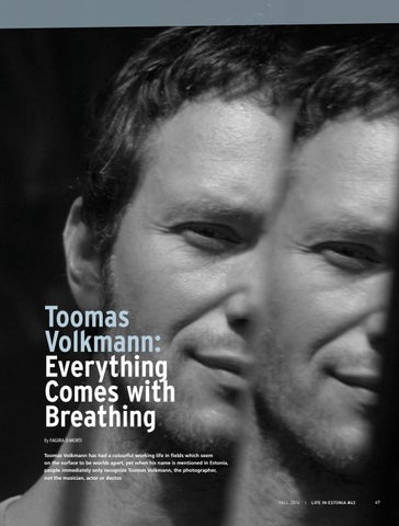 Toomas Volkmann: Everything Comes with Breathing By Fagira D.Morti Toomas Volkmann has had a colourful working life in fields which seem on the surface to be worlds apart, yet when his name is mentioned in Estonia, people immediately only recognize Toomas Volkmann, the photographer, not the musician, actor or doctor.