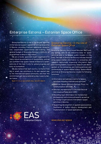 Enterprise Estonia – Estonian Space Office Enterprise Estonia is one of the largest agenciess in the national support system for entrepreneurship p in Estonia, providing financial assistance, consultaation, cooperation opportunities and training. The e general budget of Enterprise Estonia in 2009 for all ll programmes is about ₏ 400 millon. We are a locally approved expert organisation in n many industries and sectors of the economy, and we e are confident that space-related endeavours constiitute one of the main fronts for global progress and d unity of humankind. We also believe that each country, no matter how w big or small, can contribute in its own special way y to the international space community and that thiss commitment can be considered a step toward a bettter future. Even if it is a very small step, we will take it.