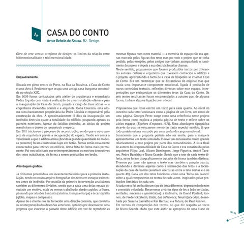 mesmas figuras num outro material — a memória do espaço não era apenas marcada pelas figuras dos tetos mas por todo o projeto que se tinha perdido, pelas emoções, pelos amigos que tinham acompanhado o nascimento do projeto e depois a sua destruição pelas chamas. Neste sentido, propusemos que fossem produzidos textos por diferentes autores, críticos e arquitetos que tivessem conhecido o edifício e o projeto, aproveitando o facto de a casa de hóspedes se chamar Casa do Conto. Era um recomeçar que se distanciava do original mas que trazia uma importante componente emocional, ligada à produção de novos conteúdos textuais, reflexões diversas sobre este espaço, interpretações que enriqueciam os diferentes tetos da Casa do Conto. Os seis textos resultantes foram encomendados a autores que, de alguma forma, tinham alguma ligação com o local. Propusemos que fosse escrito um texto para cada quarto. Ao nível do conceito cada teto funcionava como a página de um livro, um conto de uma página. Georges Perec surge como uma referência neste projeto pela forma como explora a própria página de texto e reflete sobre os vários espaços (Espèces d’espaces, 1974). Uma abordagem tipográfica através da qual se evocassem memórias fazia especial sentido, já que todo projeto estava marcado por uma profunda carga emocional. Conscientes que a proposta poderia não ser aceite, para a maquete apresentámos um texto simulado. Houve um entusiasmo muito grande relativamente a este projeto por parte dos comanditários. A lista final de autores foi responsabilidade da Casa do Conto e era constituída pelos arquitetos Filipa Leal, Álvaro Domingues, Jorge Figueira, André Tavares, Pedro Bandeira e Nuno Grande. Sendo que o teor de cada texto diferia, estes foram tipograficamente tratados de forma também distinta. Tivemos por base não apenas o texto mas também o próprio quarto, atendendo a diversos aspetos como a inclinação dos tetos e a localização da casa de banho (existiam aberturas entre o teto destas e o do quarto 49). Cada um dos tetos funcionou como uma ‘folha em branco’ sobre a qual compusemos os textos de cada autor, inspirados pelas produções literárias de cada um. A cada texto foi atribuído um tipo de letra diferente, dependendo do tom e conteúdo veiculado. Recorremos a vários tipos de letra (não serifadas, serifadas, mecanas e geométricas): a Ordinaire, de David Poulard; Jannon, de Frederick Storm; Dada, dos deValence; Neutraface Slab, desenhada por Susana Carvalho e Kai Bernau; e a Futura, de Paul Renner. Em termos de composição dos textos, no que diz respeito ao texto de Nuno Grande, dado que este autor se apropriou de uma frase de