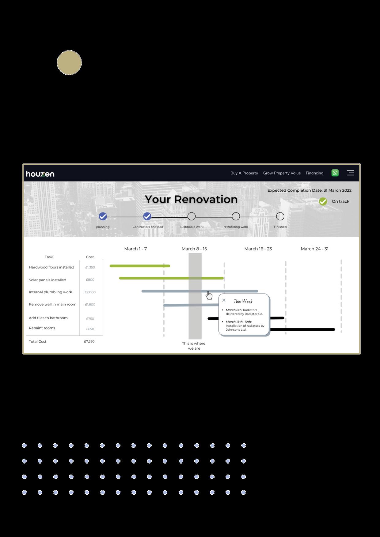 Using a platform of certified contractors who are trained to install deep retrofitting technology The homeowner can take intermittent videos to check on the progress of the project, and automated payments based on specific task completion are paid out for efficiency and transparency of the construction process. This ensures that this is installed to the highest quality, on time and on budget houzen will also screen every contractor to ensure that they are of the correct standards to perform the job.