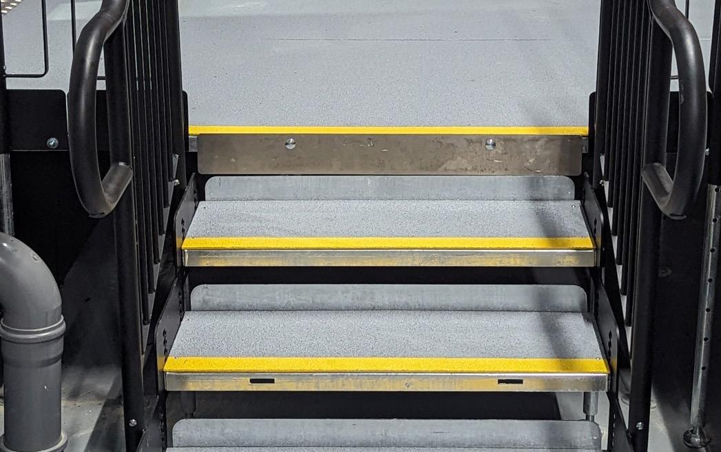This is a step unit that would be fixed to a platform. The steps feature a kerb on the top step where it meets the platform. The benefits of having a kerb, is to prevent feet being caught below the next step as a person ascends.