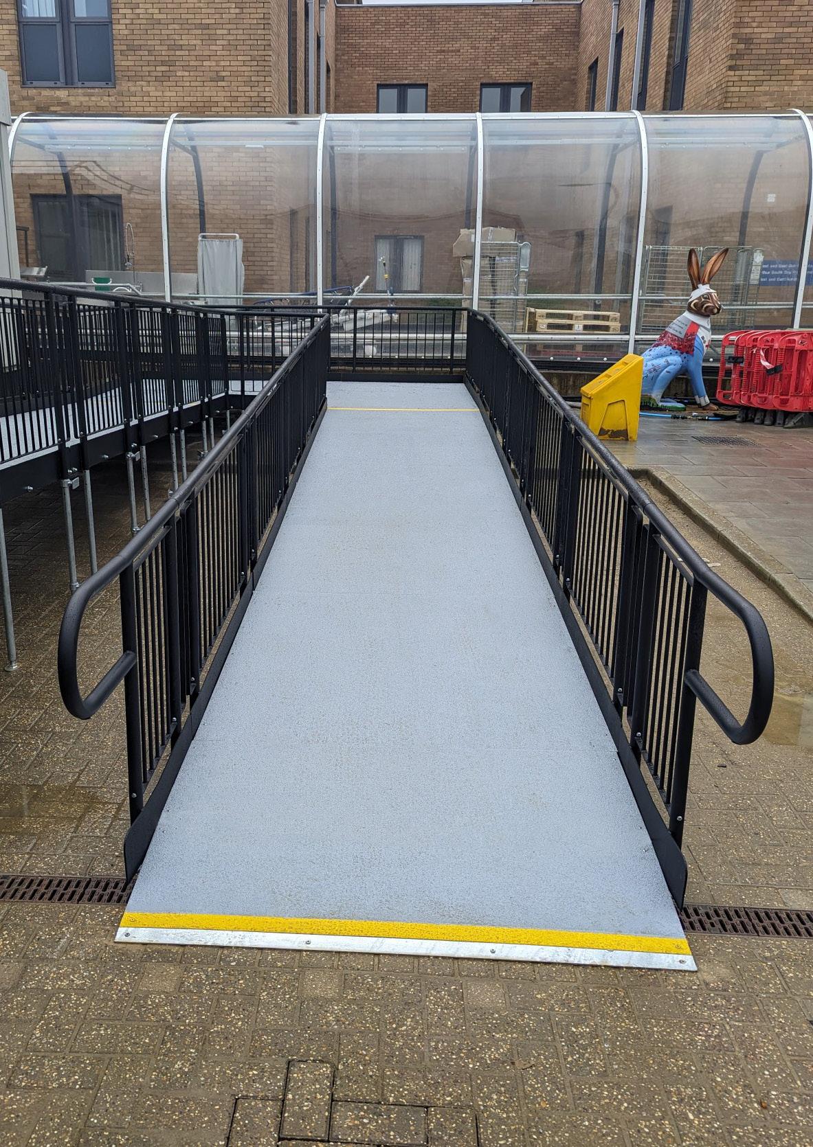We can provide a hazard warning surface such as Corduroy, Tactile or Blister effect paving – this is compatible with all our surfaces mentioned above. Hazard warning paving systems offer significant advantages over traditional yellow nosing as they provide a hard-wearing surface that warns people using the ramp, who maybe visually impaired, that there is an upcoming “hazard” such as a ramp flight or some steps. They provide fast and easy installation and provide full compliance with building regulations and the Equality Act 2010.