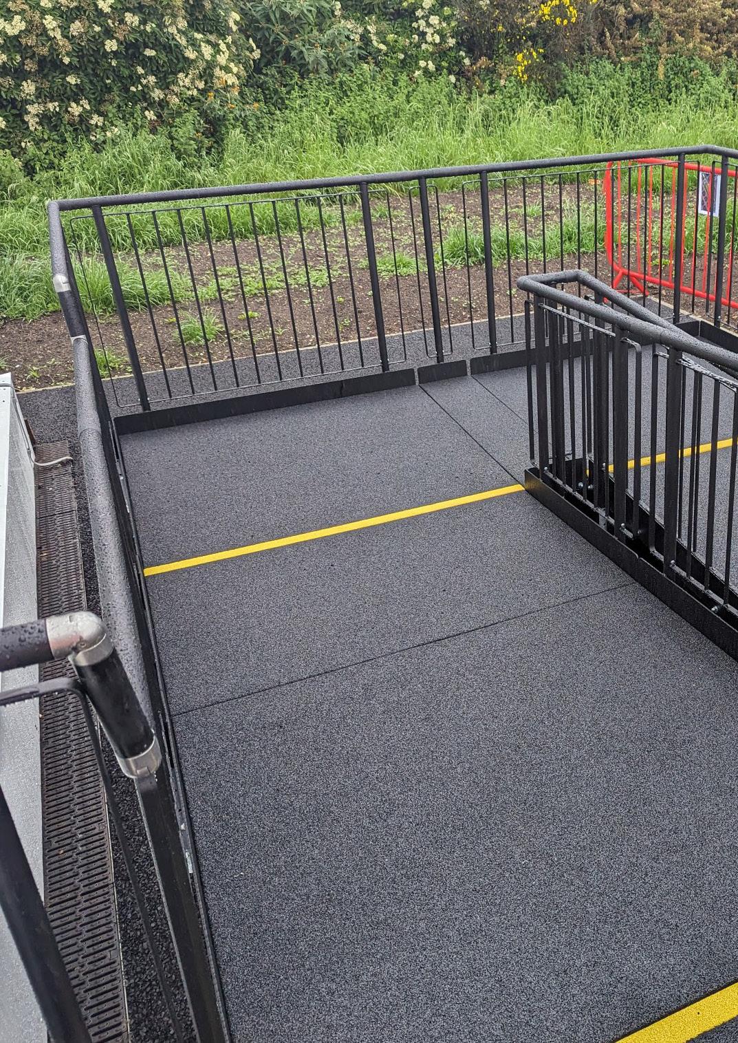 To create the Easitread platform, rubber granules are screeded on to a metal platform frame at a thickness of 15mm, using a polyurethane binder. We do not use low grade EPDM & colour coated rubber granules, but opt for the highest quality granules available in the UK.
