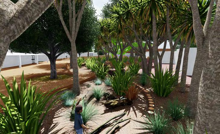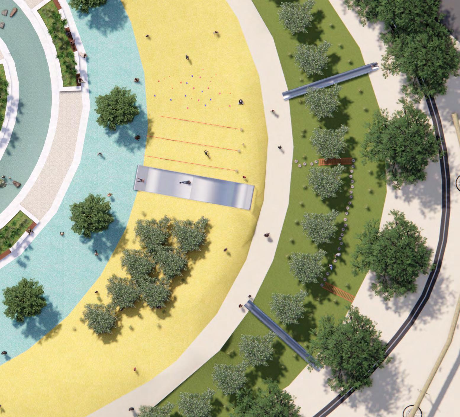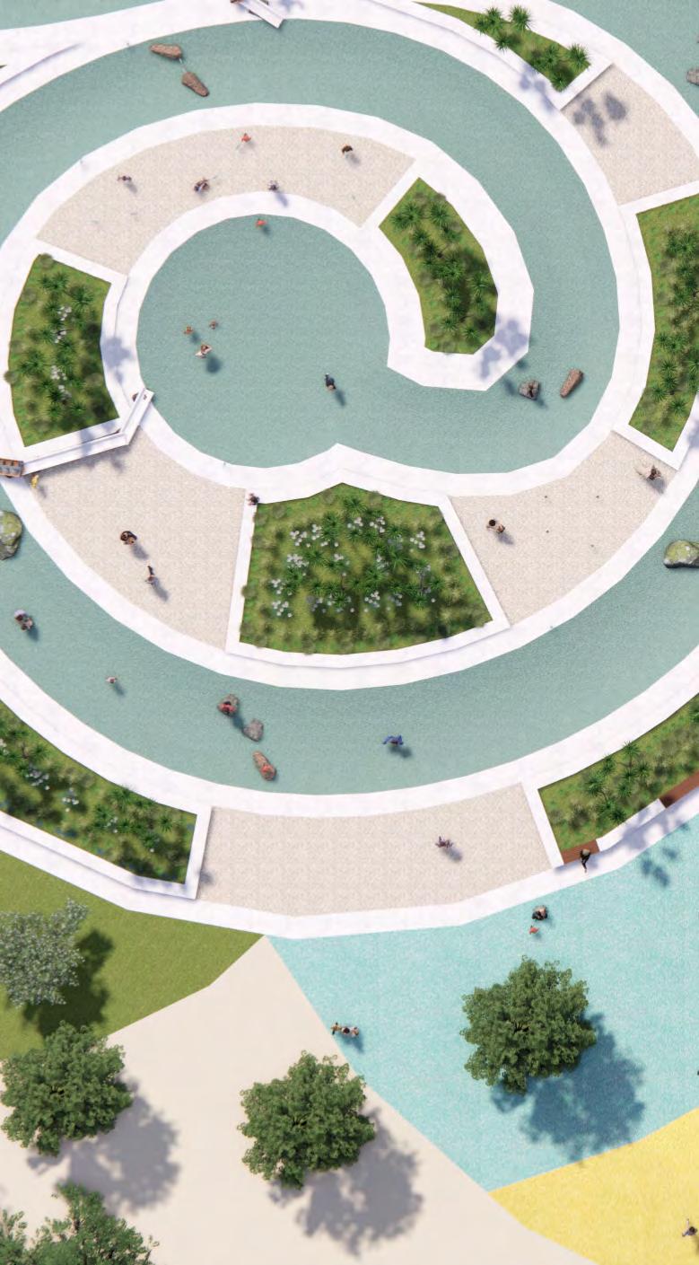 The detail design shows the area of Sand dune Playground. The design is aimed to reflect the sand dune landscape with vegetation, landform, colour palette, and activities. A water management system will be introduced to make the most of the water in the playground