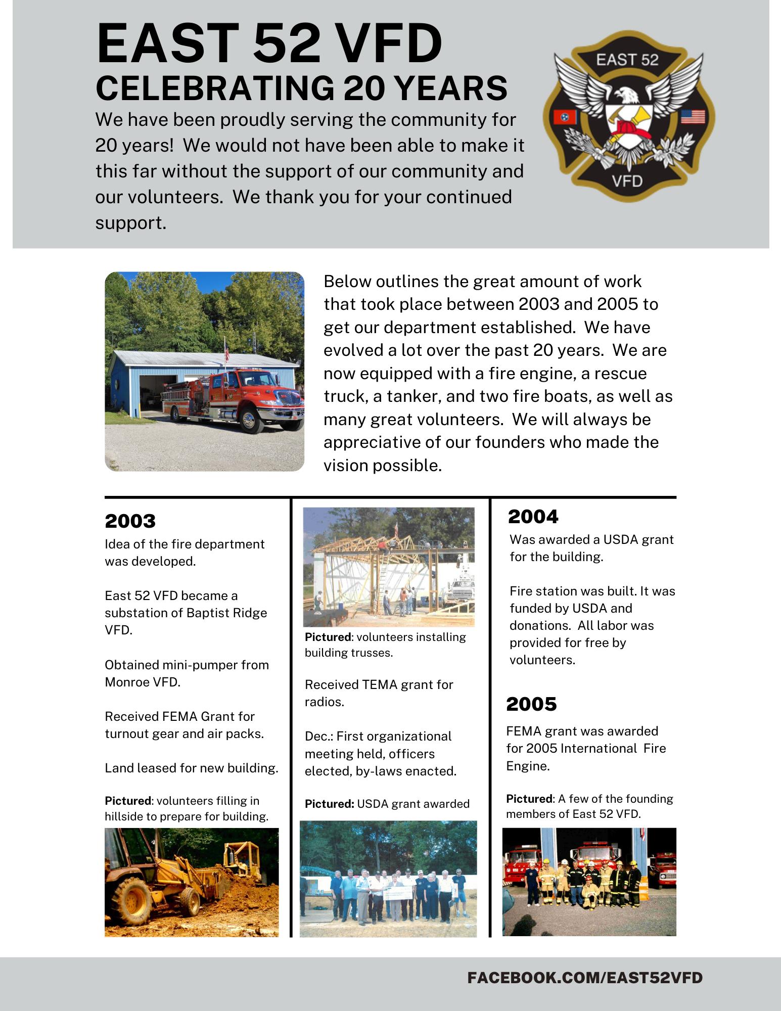 On the behalf of East 52 Volunteer Fire Department, we would like to express our appreciation for the continued support from our community over the years. The attached newsletter outlines recent fire department activities.