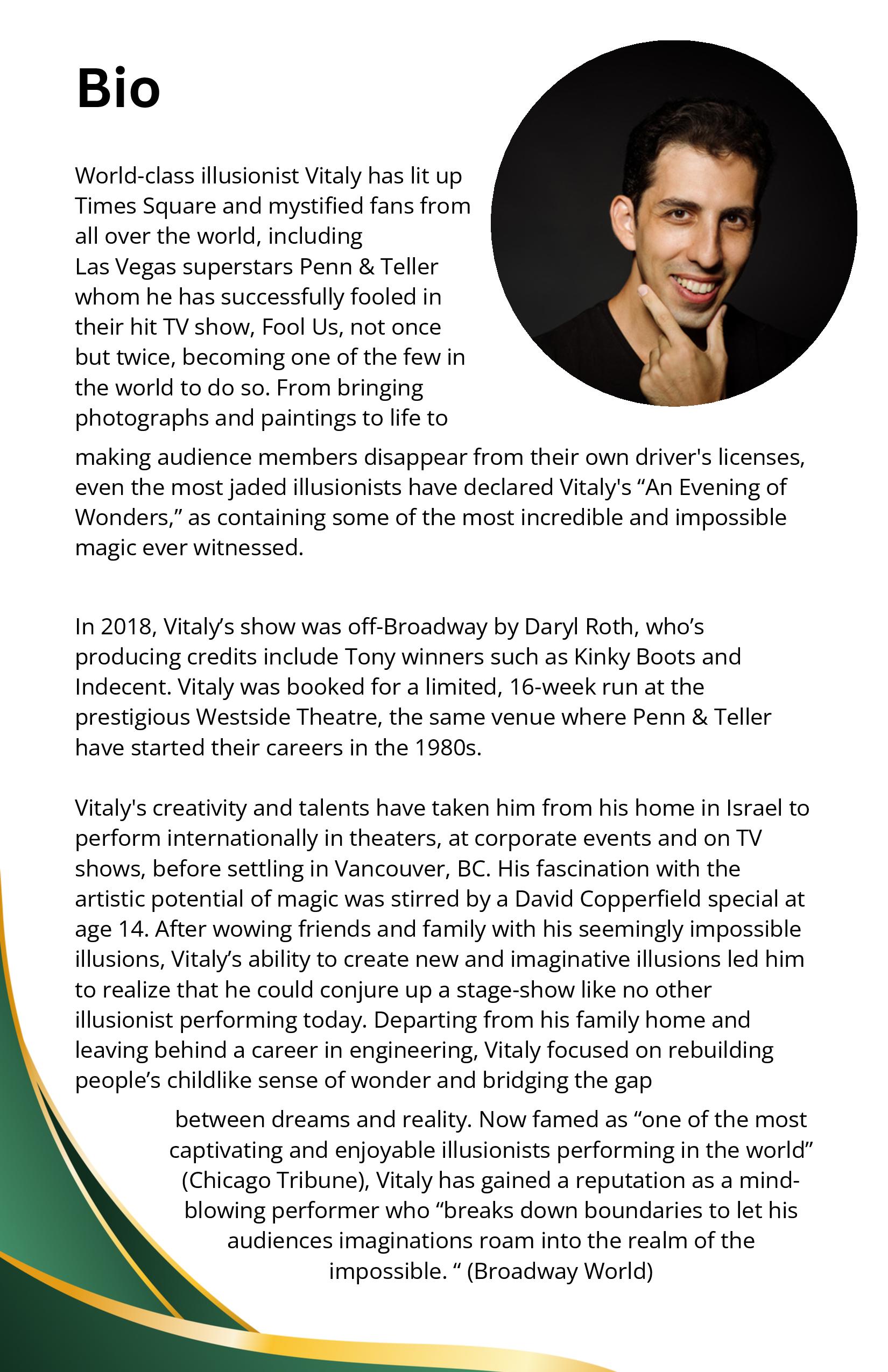 He stumped Penn & Teller twice on their hit TV show Fool Us. He lit up Times Square and amazed audiences all over the world. He is hailed as one of the most unique and innovative illusionists in the world. Now Vitaly Beckman brings his latest and most ambitious production to the stage with An Evening of Wonders.