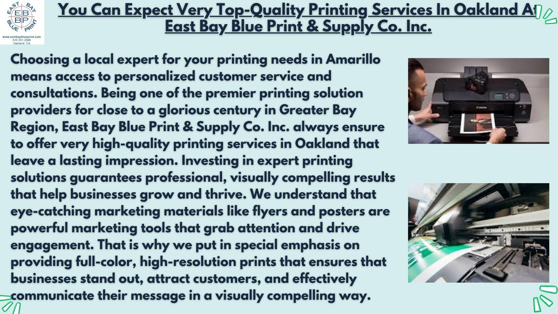 Being one of the premier printing solution providers for close to a glorious century in Greater Bay Region, East Bay Blue Print & Supply Co. Inc. always ensure to offer very high-quality printing services in Oakland that leave a lasting impression. Investing in expert printing solutions guarantees professional, visually compelling results that help businesses grow and thrive.