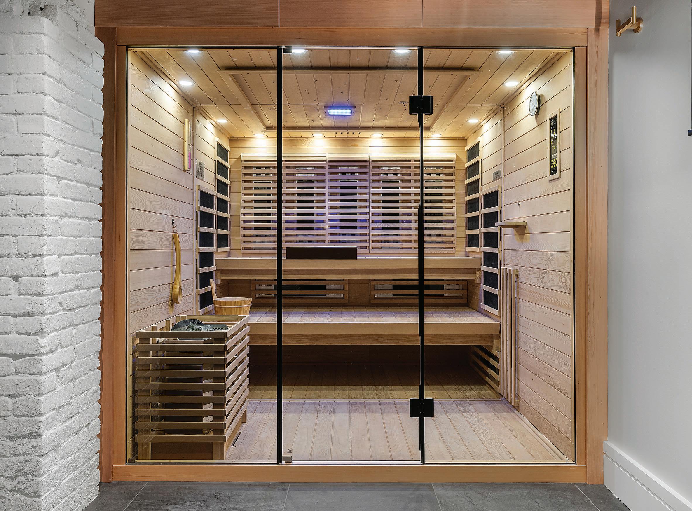 The lower level has been transformed from a firehouse basement into an enticing play space, with home theater, sauna (above), wet bar, wine closet, arcade games and more.