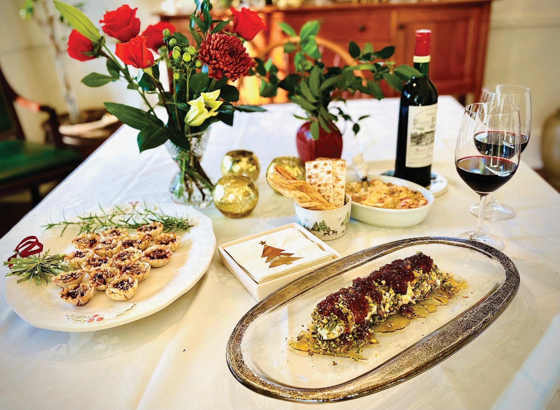 Shown (left to right) are Jam and Brie Phyllo Cups, Fig and Goat Cheese Roll with Honey, and Artichoke Feta Dip.