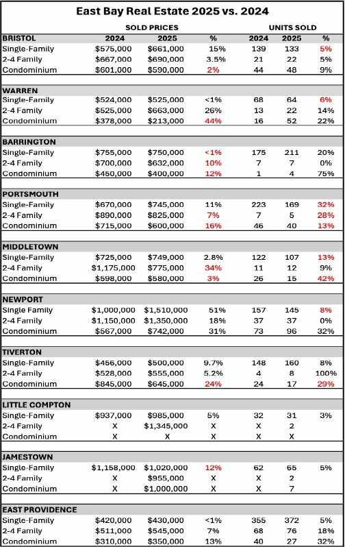 The condo market across the East Bay also seemed fatigued, as the median price declined in these six East Bay communities: Bristol, Warren, Barrington, Portsmouth, Middletown and Tiverton. Only Newport and East Providence showed price strength in the condominium market in 2025.