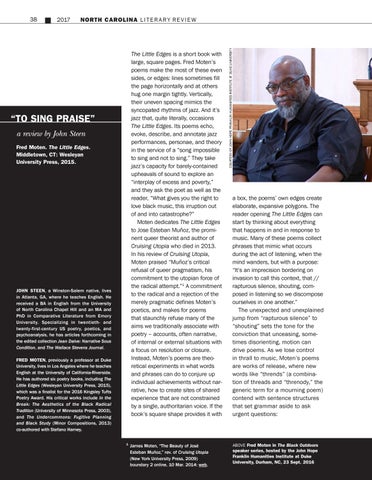 JOHN STEEN, a Winston-Salem native, lives in Atlanta, GA, where he teaches English. He received a BA in English from the University of North Carolina Chapel Hill and an MA and PhD in Comparative Literature from Emory University. Specializing in twentieth- and twenty-first-century US poetry, poetics, and psychoanalysis, he has articles forthcoming in the edited collection Jean Daive: Narrative Sous Condition, and The Wallace Stevens Journal. FRED MOTEN, previously a professor at Duke University, lives in Los Angeles where he teaches English at the University of California-Riverside. He has authored six poetry books, including The Little Edges (Wesleyan University Press, 2015), which was a finalist for the 2016 Kingsley Tufts Poetry Award. His critical works include In the Break: The Aesthetics of the Black Radical Tradition (University of Minnesota Press, 2003), and The Undercommons: Fugitive Planning and Black Study (Minor Compositions, 2013) co-authored with Stefano Harney. 1