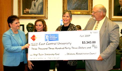 The Oklahoma Rehabilitation Council presents a check to Phyllis Kunze for $3,345 which established the Virgil Taylor Scholarship.