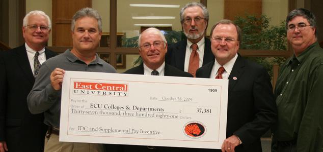 President Hargrave, Dr. Charles Biles,Dr. Patrick Bohan, Dr. Carol Bridges, Dr. Carolyn Thomas, Dr. James Burke and Dr. Duane C. Anderson pose with a $37,381 check which represents 4 different ECU colleges and departments. Not pictured: Dr. Terry Cluck, Dr. Greg Plumb and Dr. Regina Robertson.