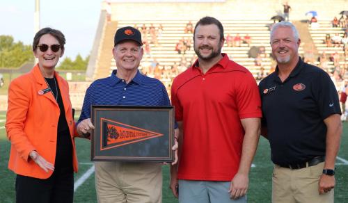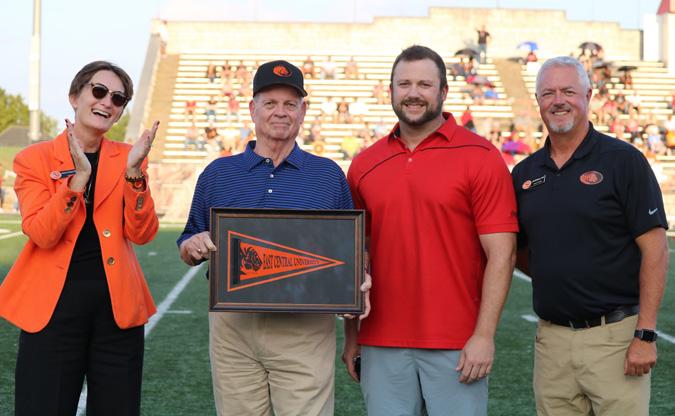 ECU President Katricia Pierson and Athletics Director Jeff Williams, far right, honored the Crabtree family during the 2019 Homecoming game for their contribution to the new video scoreboard at Koi Ishto Stadium. Accepting are Tom and Adam Crabtree.