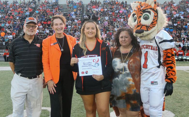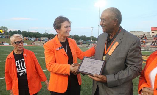 Dr. Jimmy Scales was presented with the 2019 Milam Award at halftime of ECU’s homecoming game with Southern Nazarene on Sept. 21. The award, presented at homecoming each year, goes to a former Tiger football player who has distinguished himself in his chosen profession. Scales is a nationally-recognized educator, social leader and a former superintendent of schools and was named as a 2016 Distinguished Alumni at ECU. He was one of the first two African-American football players for the Tigers.
