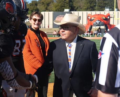 The Oct. 26 home football game served as “Chickasaw Appreciation Day”. Above left, Chickasaw Gov. Bill Anoatubby, center, accepts a framed, personalized football jersey from ECU President Katricia Pierson. Also pictured is Athletics Director Jeff Williams. Above right, Gov. Anoatubby, who performed the ceremonial coin toss before the game, shakes hands with ECU players as Dr. Pierson looks on.