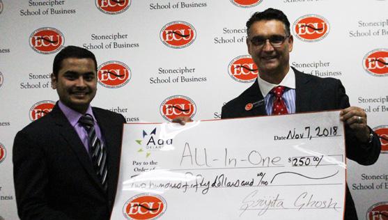 ECU student Pradip Poudel claimed the championship prize in the College Division of the recent 2018 ECU Tiger Tank Competition. Poudel’s project “All-in-One” is an app and website that lists local services offered in one easy-to-find location. Pictured with Poudel is Wendell Godwin, dean of the ECU Stonecipher School of Business. The award was presented at the Leonard Limes Lecture and Luncheon. The team of Noah Holle and Bennett Harvey placed second while Mackinsey Archer took third.