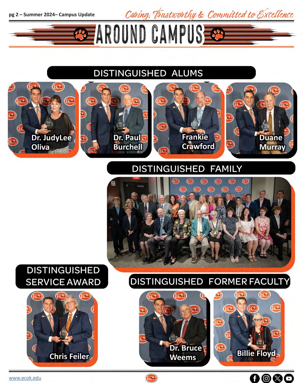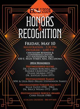 All honorees will be highlighted at the Evening of Honors on May 10 in the Chickasaw Business and Conference Center. For more information, visit ecok.edu/2024EOH.