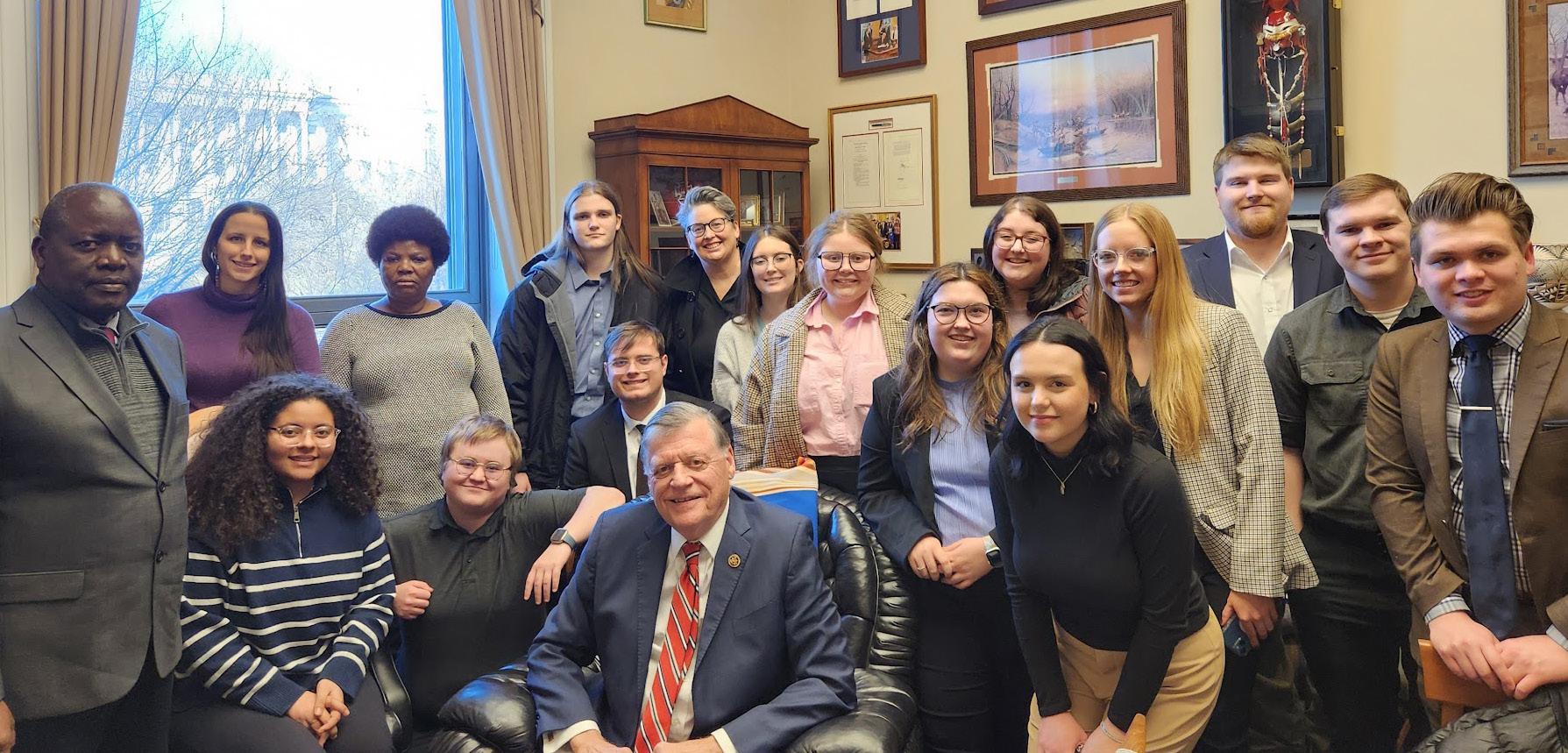 February 15-21, Political Science and Legal Studies ECU students participated in the DC Internship Experience 2024. The 13 students attended meetings and tours at the US Capitol, Supreme Court, Department of Agriculture, Library of Congress, the Kenyan Embassy, and other sites. Pictured left: students visited U.S. Senator Tom Cole (R-OK).