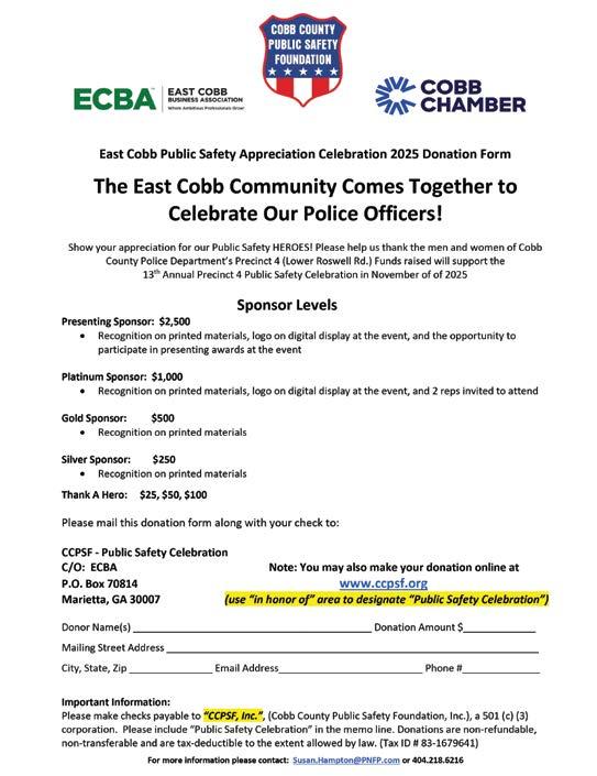 “We have been honored to plan this special event for the past twelve years, and are confident that our generous community will continue to provide the financial support needed to make this appreciation celebration very meaningful for these special heroes,” says Susan Hampton, co-chair of the East Cobb Public Safety Celebration committee.