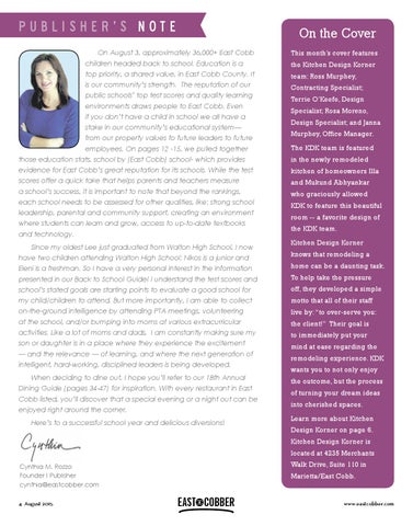 activities. Like a lot of moms and dads, I am constantly making sure my son or daughter is in a place where they experience the excitement — and the relevance — of learning, and where the next generation of intelligent, hard-working, disciplined leaders is being developed. When deciding to dine out, I hope you’ll refer to our 18th Annual Dining Guide (pages 34-47) for inspiration. With every restaurant in East Cobb listed, you’ll discover that a special evening or a night out can be enjoyed right around the corner. Here’s to a successful school year and delicious diversions!