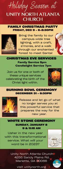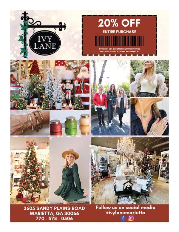 December is a month to celebrate miracles—Hanukkah and Christmas. Though this holiday season is one of the most magical times of the year, many of us often find the season to be stressful. I hope you are giving yourself a break from the holiday rush by reading this issue of the EAST COBBER. To make your life a little easier, check out the Holiday Happenings (see pages 22-27) we have compiled to help you make special memories this season. You can also get some gift-giving ideas throughout this issue. The merchants featured are in our backyard, so that should make your shopping a little easier. That perfect gift may be found in the gift selections they offer or the story behind the gifts themselves, like the East Cobb women featured on pages 28 & 29. If you need a reminder to gift yourself, check out the self-care tips on page 35 in the Health & Wellness section.