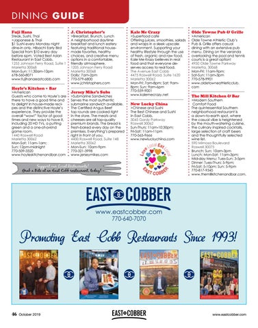 >American Olde Towne Athletic Club’s Pub & Grille offers casual dining with an extensive pub menu. Dining on the veranda overlooking the pool and tennis courts is a great option! 4950 Olde Towne Parkway Marietta, 30068 Mon-Fri: 11am-9pm; Sat-Sun: 11am-3pm 770-578-9901 www.oldetowneathleticclub. com .......................................................