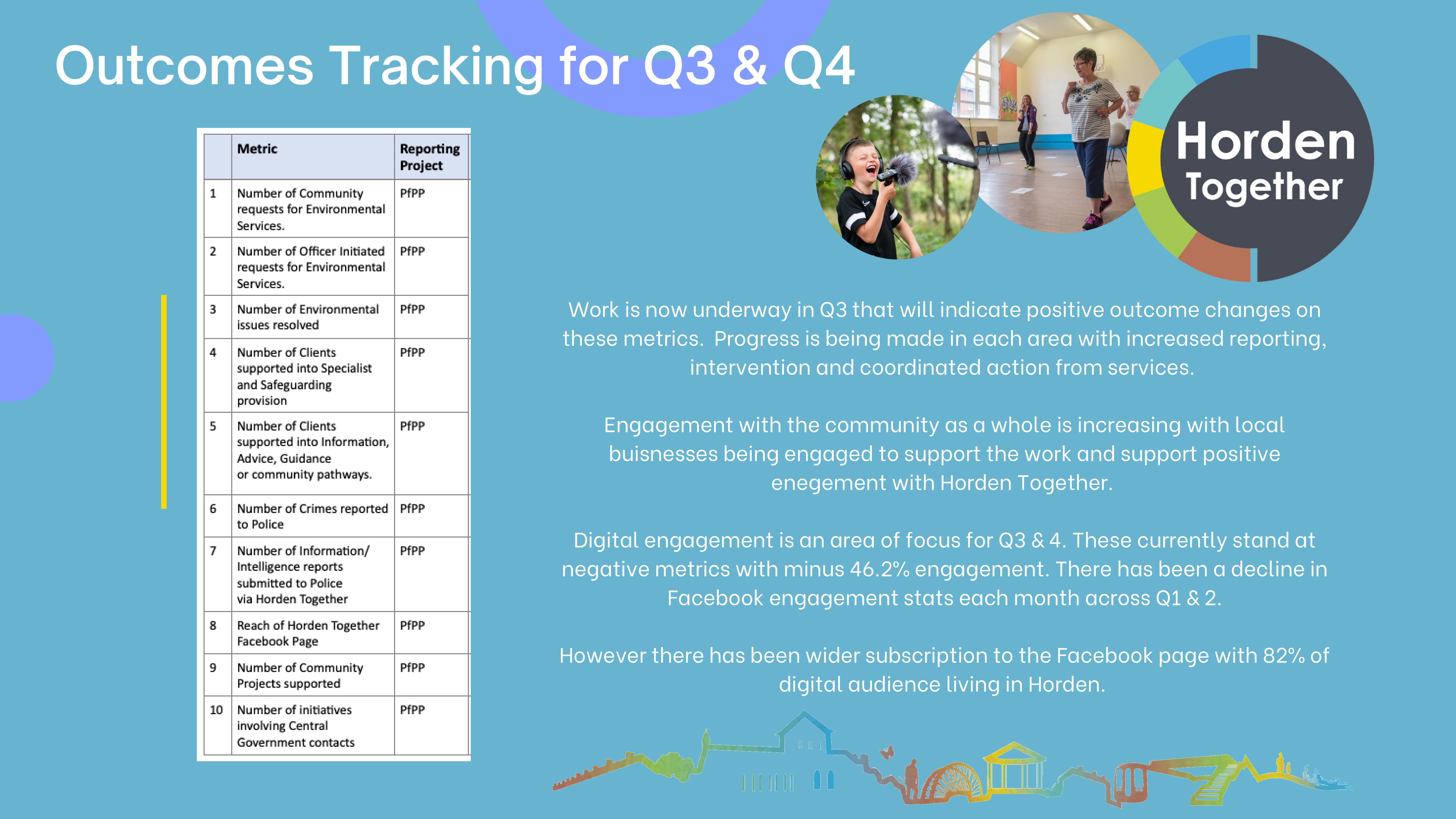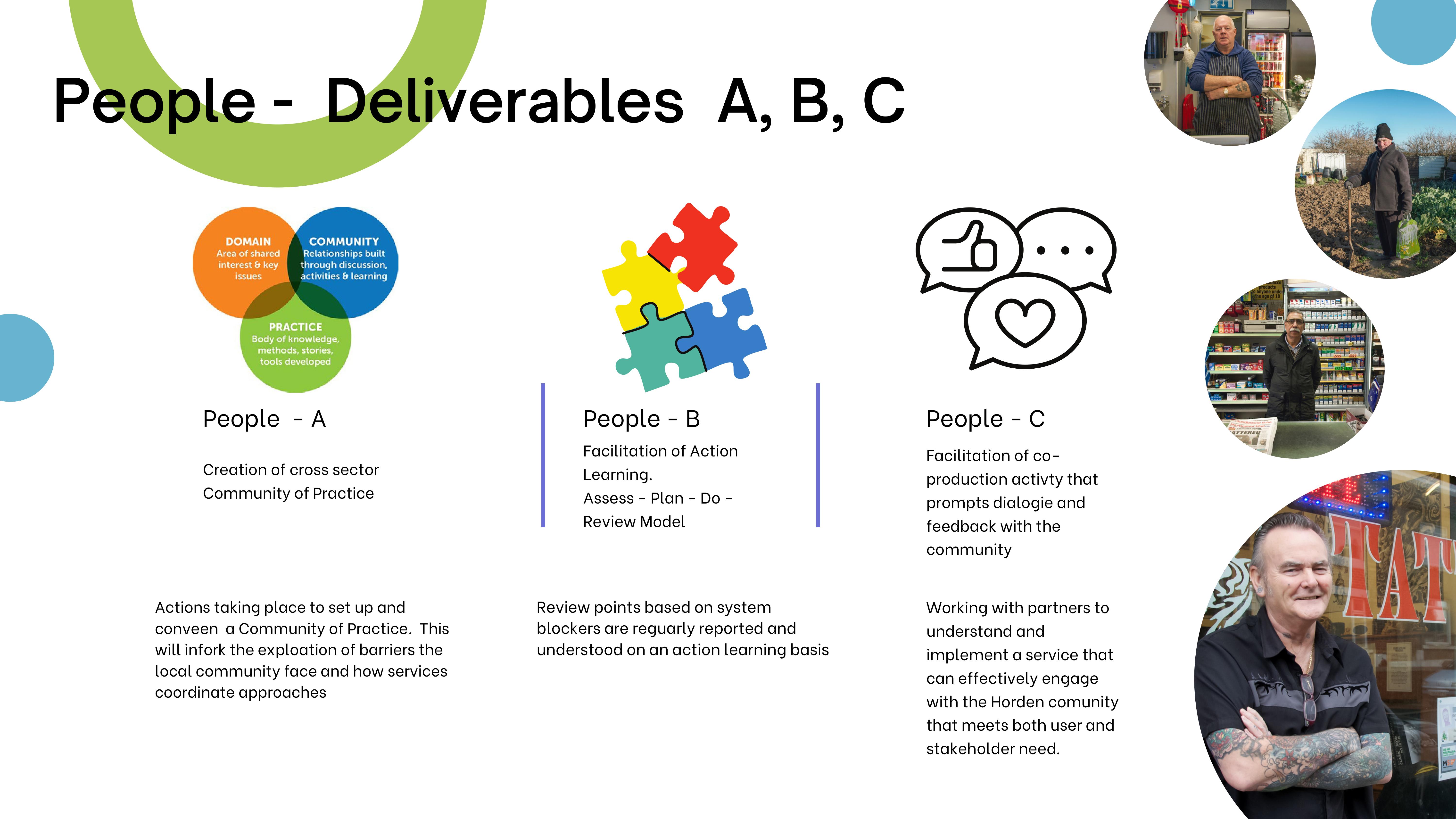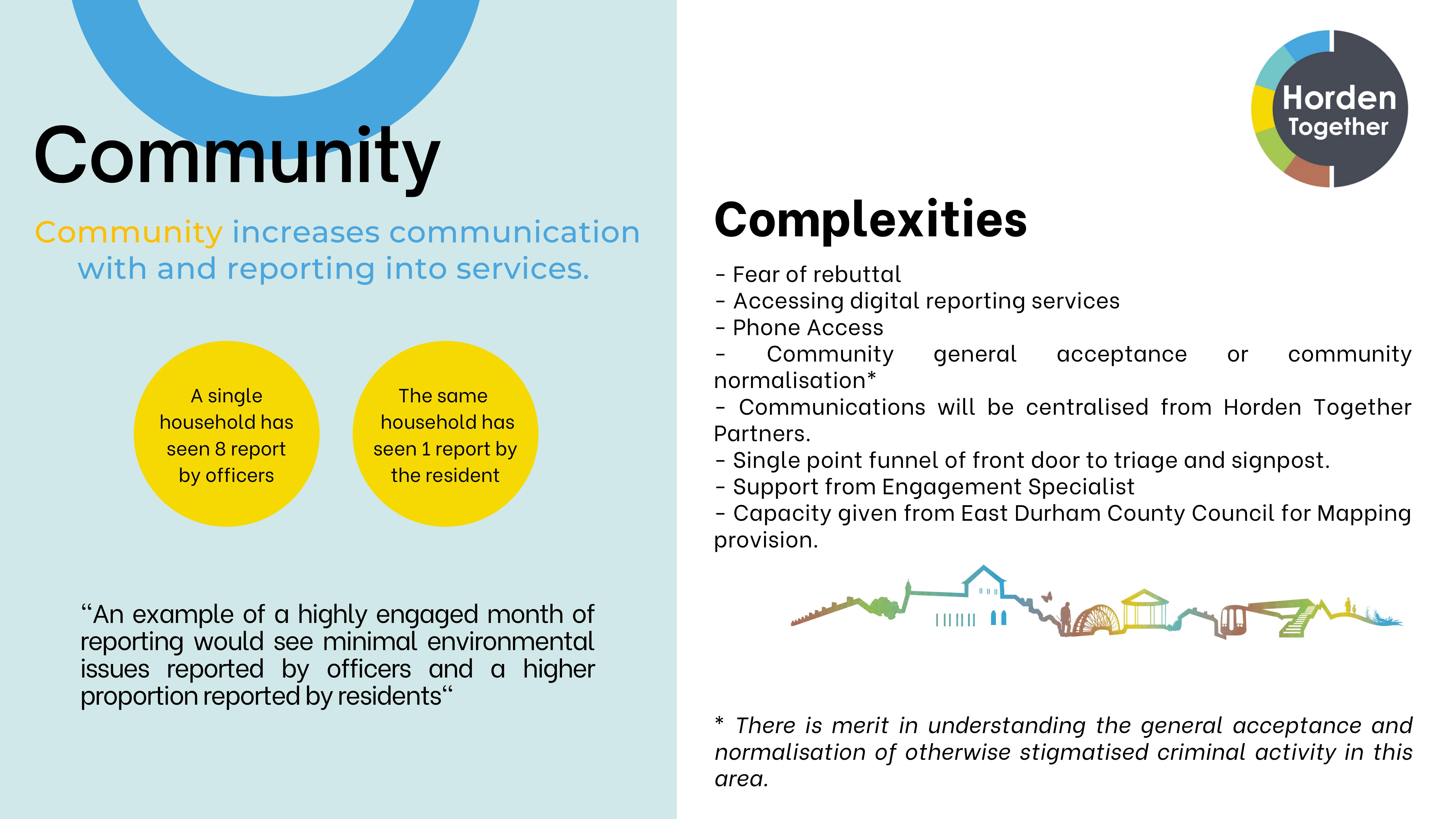 Partnership for People and Place project (PfPP) - is a pilot of a new place policy design and delivery approach, focusing on place-based initiatives, which are aimed at creating better cross-government coordination. Horden Together has been working to deliver investigations into three thematic areas of 'Community' 'People' and 'Place'. The outputs of this activity are upheld by multi-stakeholder Theory of Change workshops and are being delivered directly with and by our community. The outcomes of these sessions will test a new way of working with central government to improve local outcomes for Horden residents. This report outlines progress to the mid way point of this action.