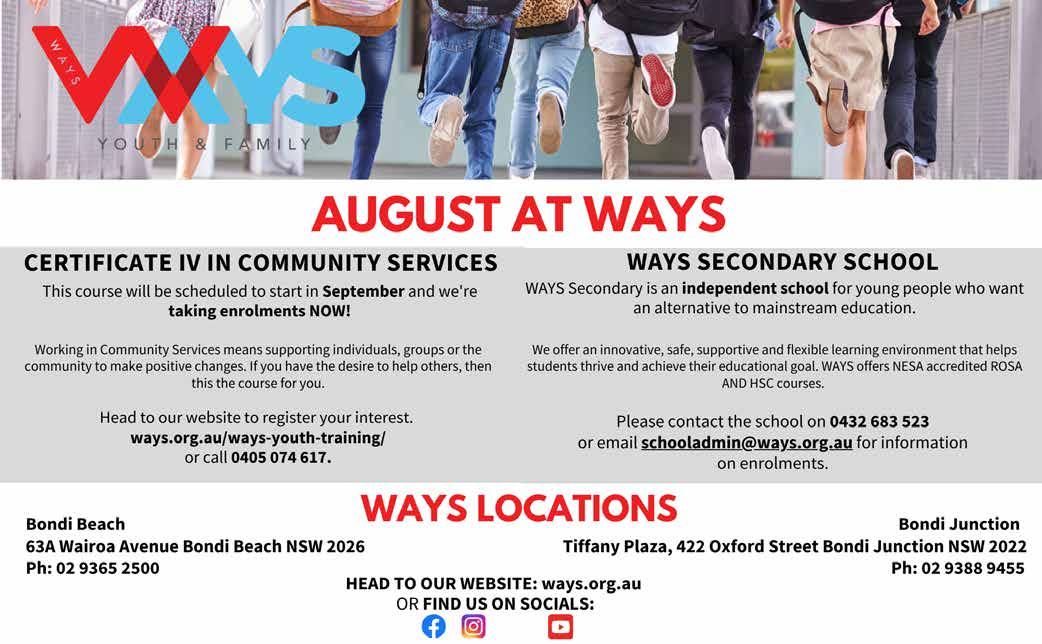 YOUR FREE MONTHLY LOCAL NEWSPAPER Edition 56, Aug, 2023 EASTERN SUBURBS www.easternsuburbslife.com www. easternsuburbs.network THE BATTLE OF POZIÈRES REMEMBERED P4 • WHAT'S ON BAYSIDE P5 • THREE STRIKES FOR MERITON’S LITTLE BAY COVE DEVELOPMENT PROPOSAL P11 • AWARDS FOR SPORTING ACHIEVEMENTS NOW ACCEPTING NOMINATIONS P11 • WHAT'S ON SE VOICE P12-13 • CITY2SURF ROAD CLOSURES P16 •WHAT'S ON BONDI P17 • COUNCILS N EWS P21 • ESL DIRECTORY P23 INSIDE: