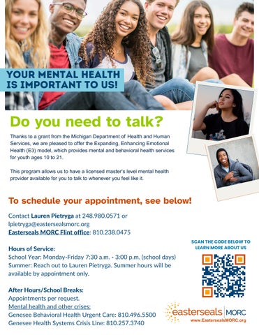 Thanks to a grant from the Michigan Department of Health and Human Services, we are pleased to offer the Expanding, Enhancing Emotional Health (E3) model, which provides mental and behavioral health services for youth ages 10 to 21