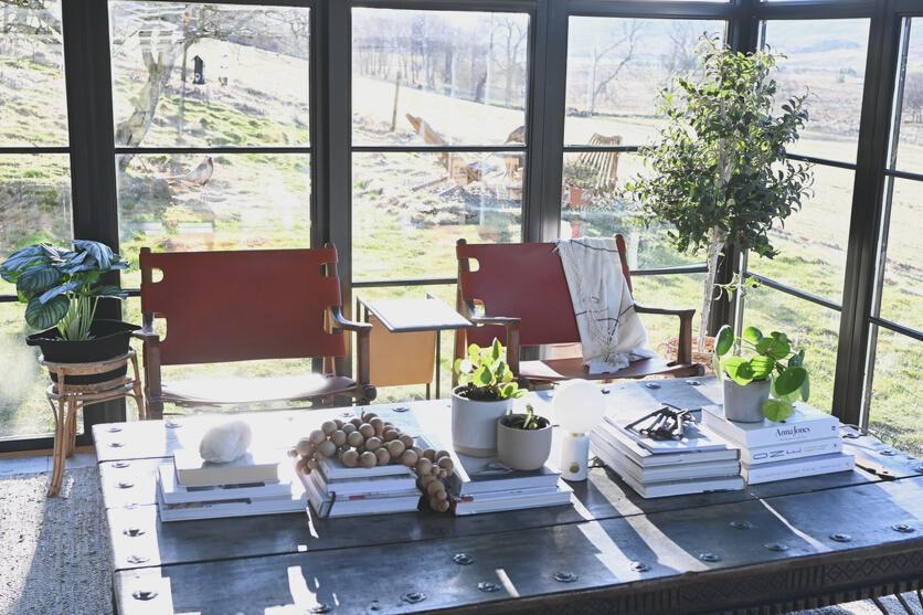 We moved the smaller coffee table out and the big Mallorca monastery door table in We removed a sofa and opened the space with the 2 leather belt chairs (Soho home) The area felt much lighter, adding even more fresh greenery, and we haven't moved from here since! Our clients love the change, too, as they also experience the complete joy of the Glen on video calls.
