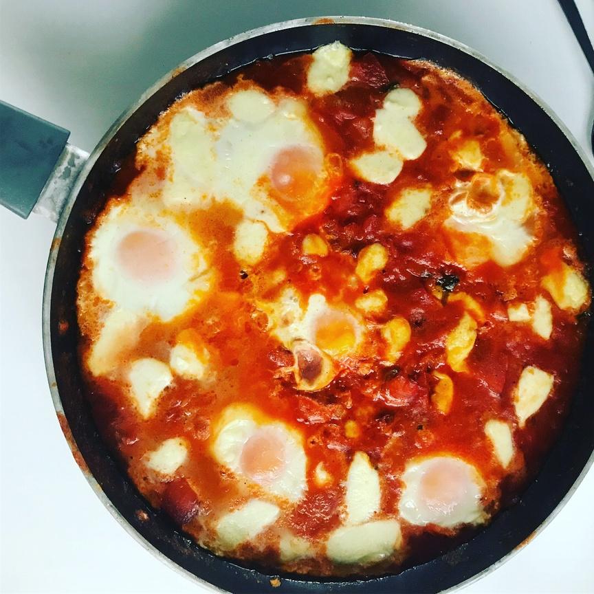 Crack each egg and drop individually into the sauce, around the pan, and add the mozzarella broken into pieces around the pan too Put on a lid or foil Allow to simmer until the eggs whites have soft set