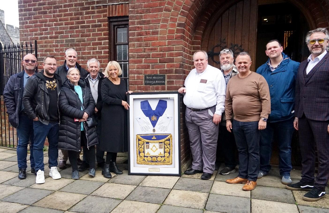 The visit was special because Mrs. Horn had brought with her the beautifully framed set of regalia of her late husband Raymond. Richard White, a Trustee and the Secretary of the Kent Masonic Museum and Library Trust, was pleased to receive the regalia from Mrs. Horn. It will be on permanent loan to the Museum for the lifetimes of Mrs. Horn and her daughter.