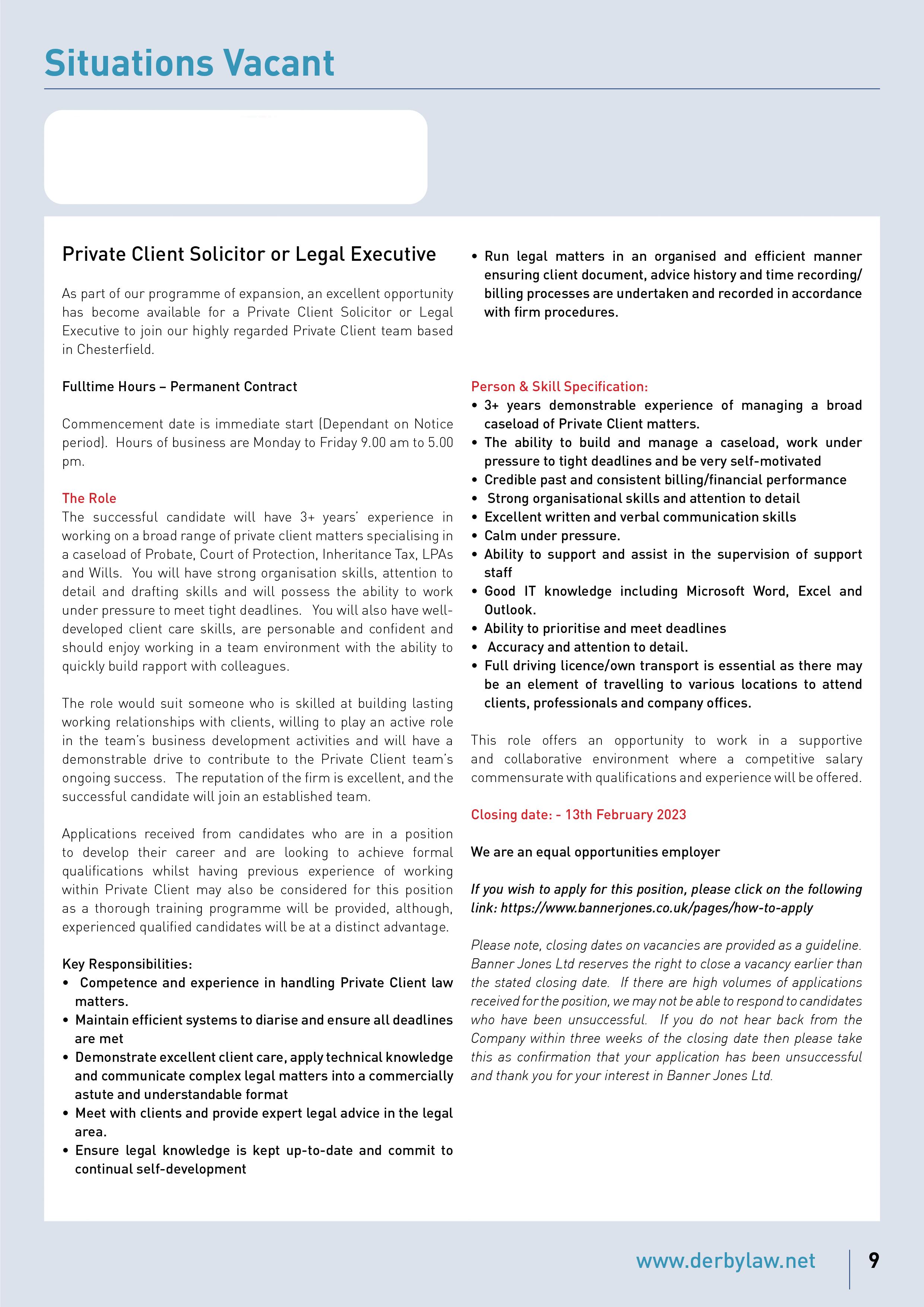 Solicitors’ Benevolent Assoc. area representative Peter Lord 9 Larkhill, Swanwick DE55 1DD Tel: 01773 541753
