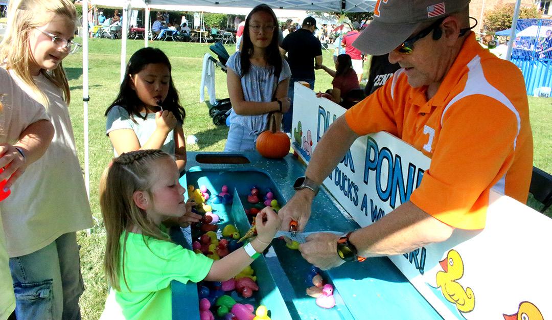 An estimated 1,000 people attended the 75th annual Fall Festival at St. Mary Church in Oak Ridge Oct. 17-18. A spaghetti dinner hosted by the Knights of Columbus and a live auction kicked off the festival on the first day. On Oct. 18, the event continued with live entertainment; a hayride to a pumpkin patch; regional vendors offering handmade goods, crafts, and seasonal treats; the White Elephant Sale; tamales and more at the Cantina Booth; classic carnival games and inflatable attractions; face painting; and a silent auction. The photos depict St. Mary pastor Father Ray Powell with parish director of religious education Monica Price, and St. Mary School third-grader Ka’Lyah Smith soaking associate pastor Father Jhon Mario Garcia with her accurate throw at the dunking booth. Ka’Lyah, on crutches with an injured knee, asked a classmate to hold her crutches so she could make the toss. Also pictured are headmaster Zach Summers and students of the Chesterton Academy of St. Margaret Clitherow in Knoxville at their festival booth, where they pressed apples for fresh cider for attendees and invited them to press their own cider. Mr. Summers also took a turn in the dunking booth.