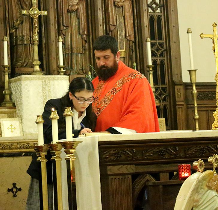 Father Neil Blatchford, chaplain for the Chesterton Academy of St. Margaret Clitherow in Knoxville, celebrated a Votive Mass of the Holy Spirit on Sept. 10 at Holy Ghost Church in Knoxville with students, staff, and families attending. The Mass is a Chesterton Schools Network tradition to celebrate the start of the academic year, in which faculty and students gather to invoke the Holy Spirit’s guidance and blessing. Relics that included the Blessed Virgin’s veil were provided by Tom Charron, a Holy Ghost parishioner, and displayed in front of the altar during the Mass. In the top photo, students stand and profess the Oath of Conduct that followed the homily. At bottom left, 11th-grader Sarah Daigle signs the Oath of Conduct as Father Blatchford witnesses. At bottom right, ninth-graders (from left) Oliver Carr and John Toliver hold a scroll with the Oath of Conduct, and headmaster Zach Summers and music teacher Mary Weaver hold a scroll with the Oath of Fidelity to the Magisterium that the faculty professed and signed. Behind them is Samuel Daigle.
