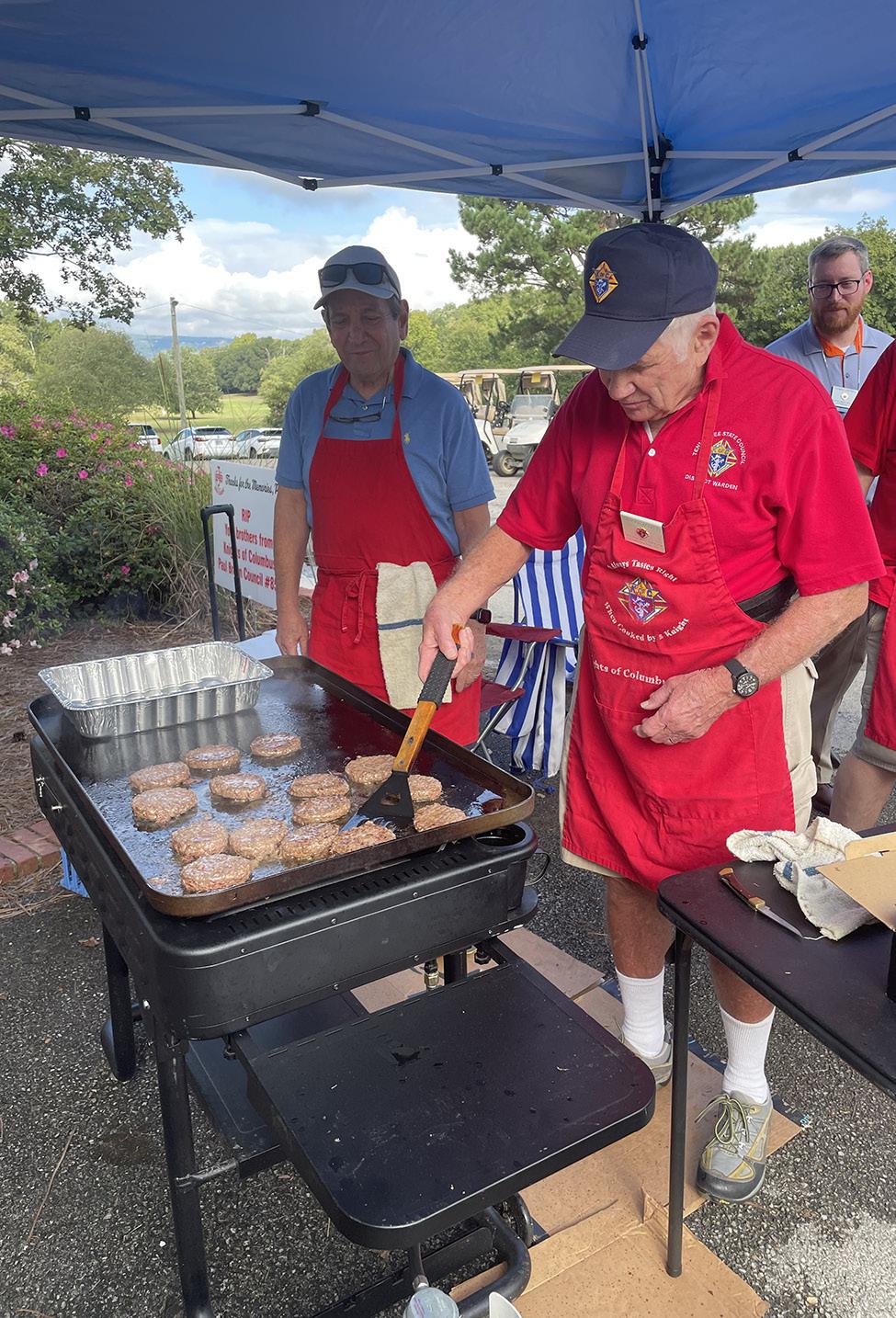 St. Jude School and Knights of Columbus Council 8576 in Chattanooga co-hosted their annual golf tournament on Sept. 26 at Creeks Bend Golf Club in Hixson. This was a major fundraiser for both organizations, with money raised going for classroom improvements and the council’s charitable works. The tourney was a full-parish event as the Knights along with faculty, parents, and supporters of the school all worked together. In the golf cart are Deacon Paul Nelson (left) and Deacon Brian Gabor, preparing to tee off. In the photo at right, Glenn Gravett (left) and Raleigh Cooper cook hamburgers.