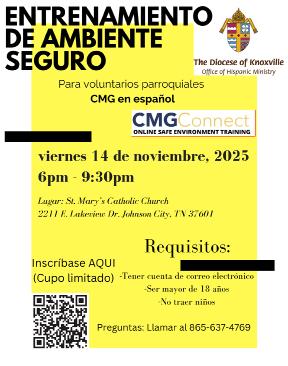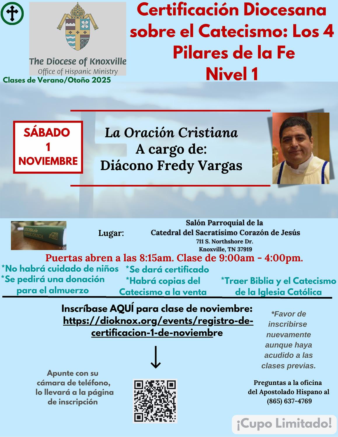 próxima clase es el 1 de noviembre: “La Oración Cristiana” a cargo del Diácono Fredy Vargas. Todas las clases se realizarán en el Salón Parroquial de la Catedral del Sacratísimo Corazón de Jesús, de 9 AM a 4 PM. Las puertas se abren a las 8:15 AM. La entrada es gratis, solo se pedirá una donación para el almuerzo. Se dará un certificado de participación. Para más información o para registrarse, llame a Rocío Meléndez al 865.637.4769 o escriba a rmelendes@dioknox.org. También puede registrarse en línea para la clase de noviembre visitando la página web de la diócesis en la sección de eventos.