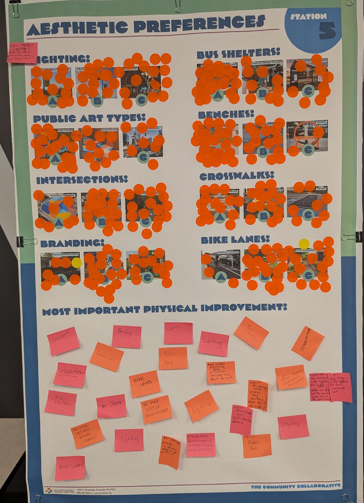 In Station 5, participants were asked to choose their aesthetic preference for several pedestrian- and commuter-focused areas of design (e.g., lighting, crosswalks, bus stations, etc.). Similarly to Station 3, participants were again asked to view the given picture choices as examples of design styles, not as final proposed designs.