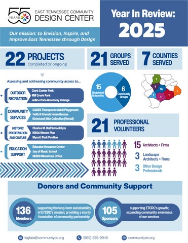 The objective of ETCDC has been to make East Tennessee a better place by bringing professional design and planning assistance to communities and organizations lacking resources to acquire those services. Our mission is to Envision, Inspire, and Improve East Tennessee communities through design, collaboration, and leadership. The ETCDC also serves as a catalyst to initiate projects within our service area and serves as an advocate for quality design in the public realm. The ETCDC offers these services through the probono contributions of area architects, landscape architects, planners, engineers, and other professionals.