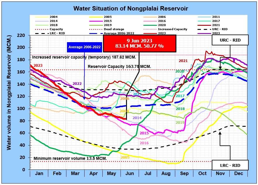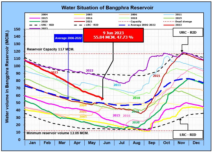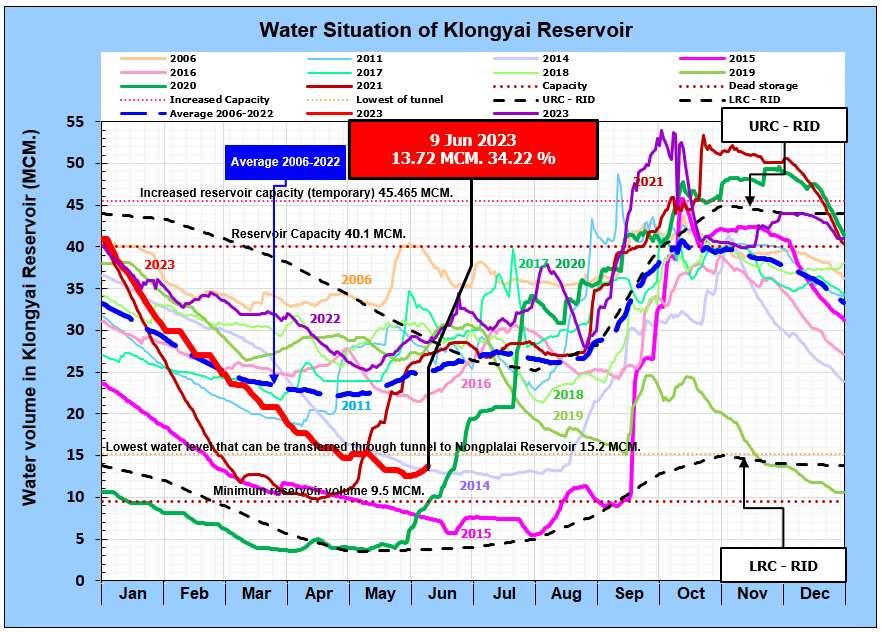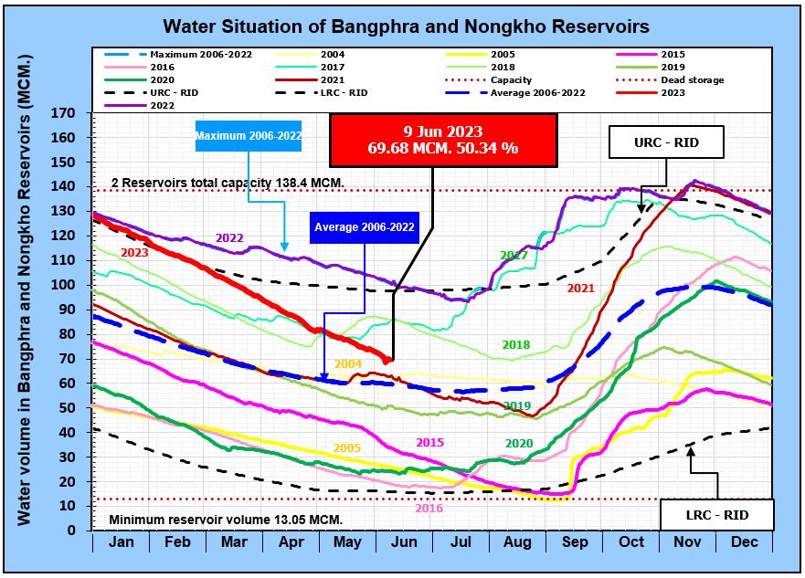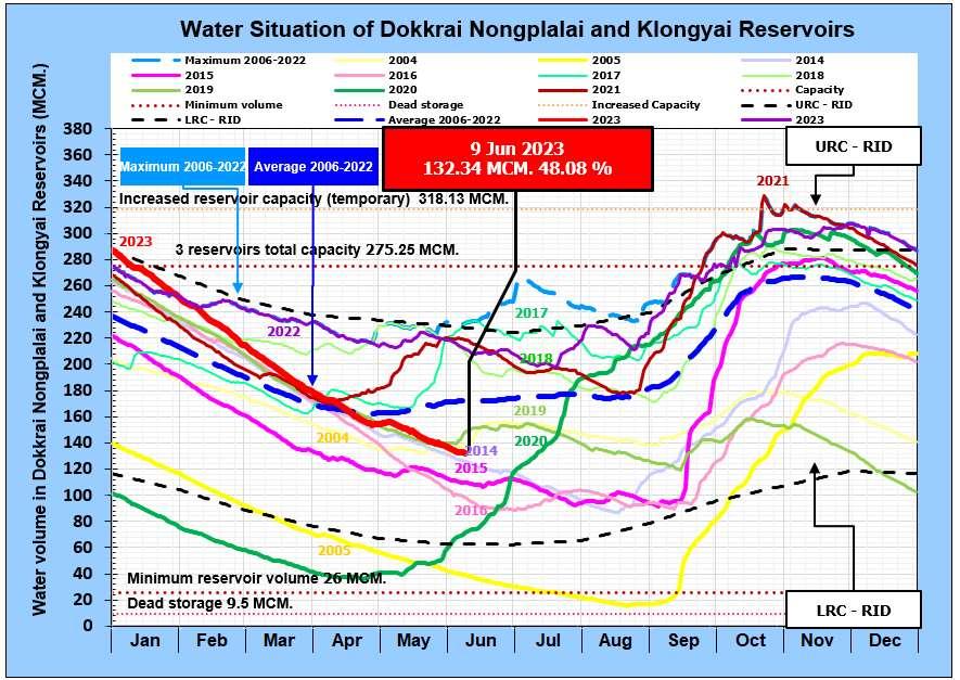 1 Chonburi Rayong BangPhra Nong Kho Dokkrai Nong Pla Lai Klong Yai Prasae Reservoir capacity (MCM) (Temporary increase) 117.00 21.40 71.40 (79.41) 163.75 (187.62) 40.10 (51.10) 295.00 Current storage volume (MCM) on 9th Jun 2023 55.84 13.84 35.48 83.14 13.72 191.80 Percentage of reservoir capacity 48% 65% 50% 51% 34% 65.0% Useable storage volume (excluding Dead Storage) (MCM) 43.79 12.84 32.48 69.64 10.72 171.80 Inflow into reservoir (MCM) (On 8th Jun 2023) - 0.353 0.2410.594 Water volume compared to previous week (-decrease, +increase) (MCM) -2.28 -0.68 -3.04 -1.82 +1.06 -4.22 -2.96 -3.79 Total water volume in each area 69.68 MCM (50.30%) 132.34 MCM (48.08%) Ref: water situation from RID on 9th Jun 2023